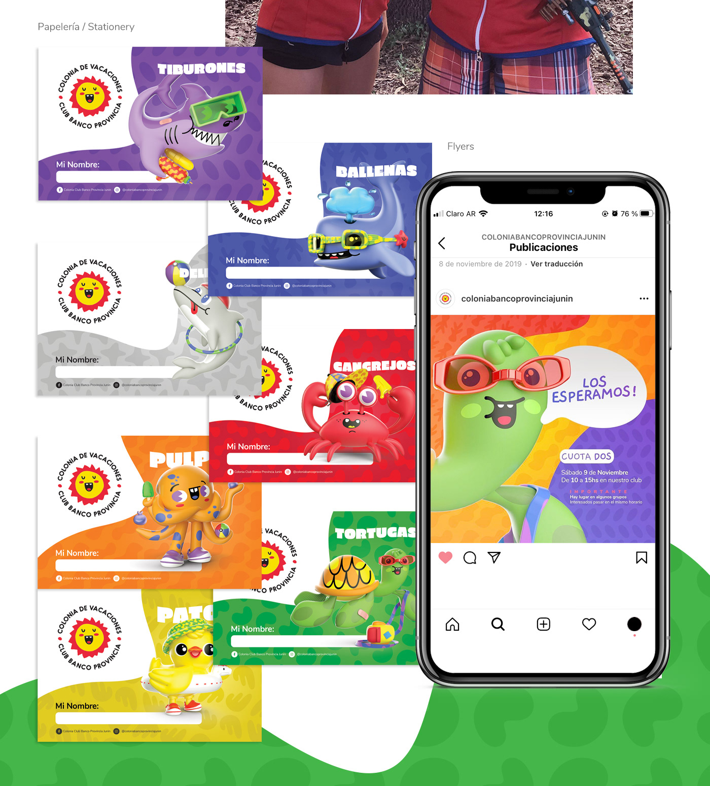 Diseño de personajes y identidad visual para la Colonia de Verano Club Banco Provincia. Texturas, personajes, colores, tipografías Character design and visual identity for the Colonia de Verano Club Banco Provincia. Textures, characters, colors, fonts
