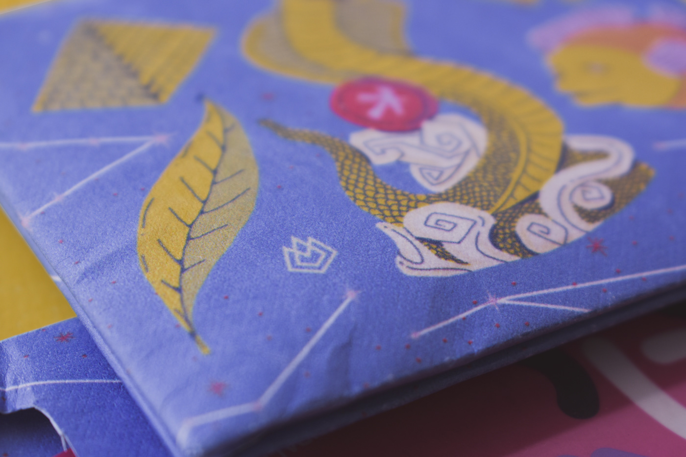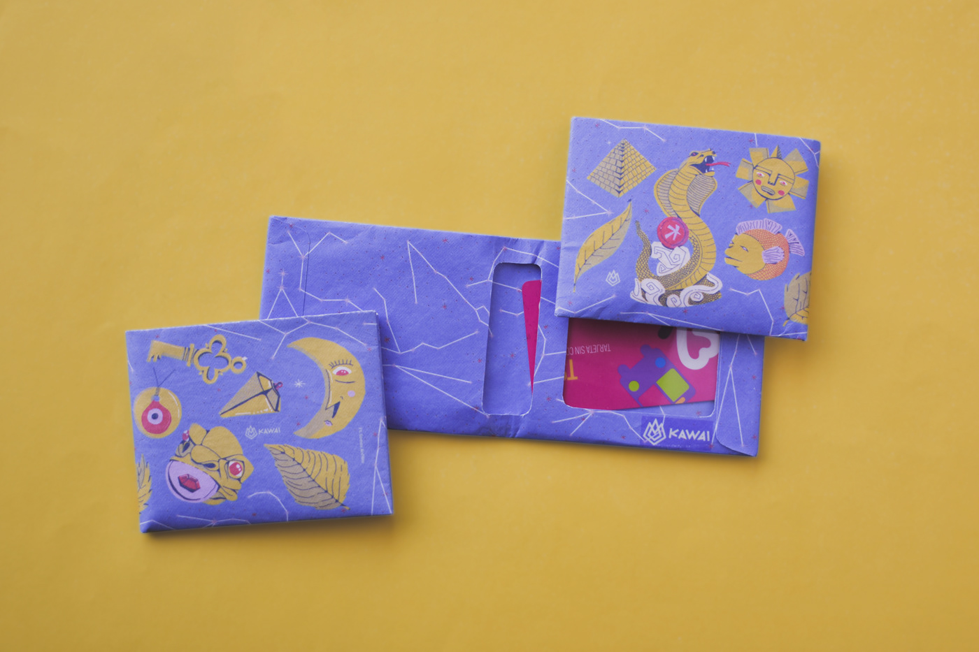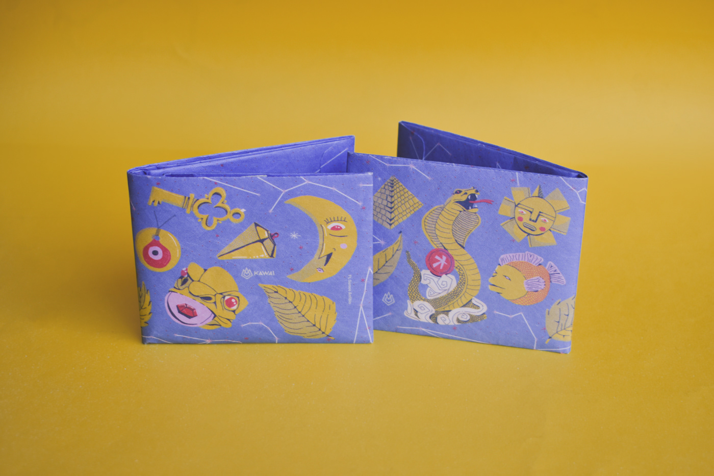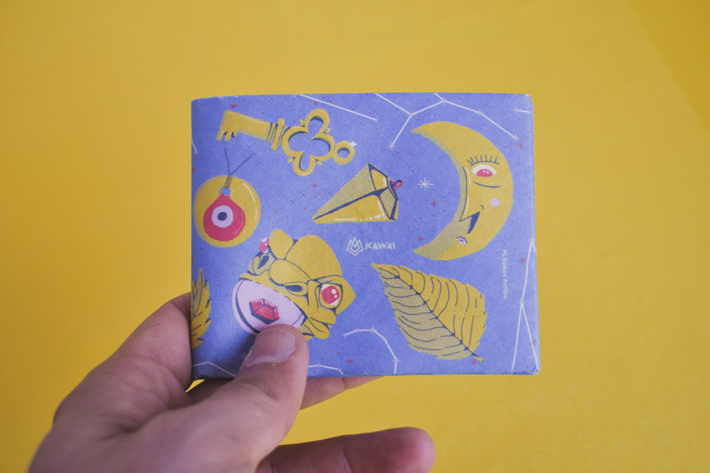 Serie de 12 ilustraciones para billeteras ecológicas de tyvek. La serie está basada en amuletos de la suerte de cada signo zodiacal.